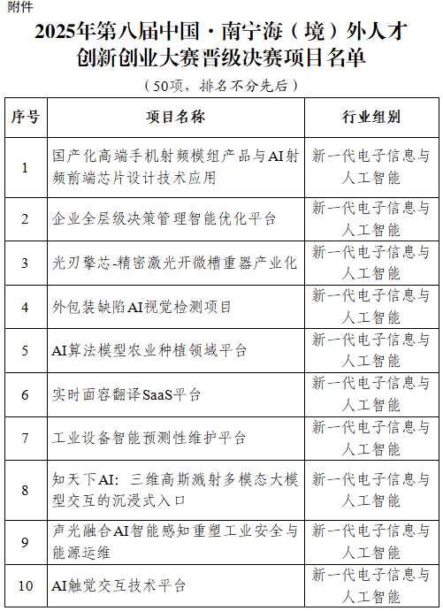 附件:2025年第八屆中國(guó)·南寧海(境)外人才創(chuàng)新創(chuàng)業(yè)大賽晉級(jí)決賽項(xiàng)目名單